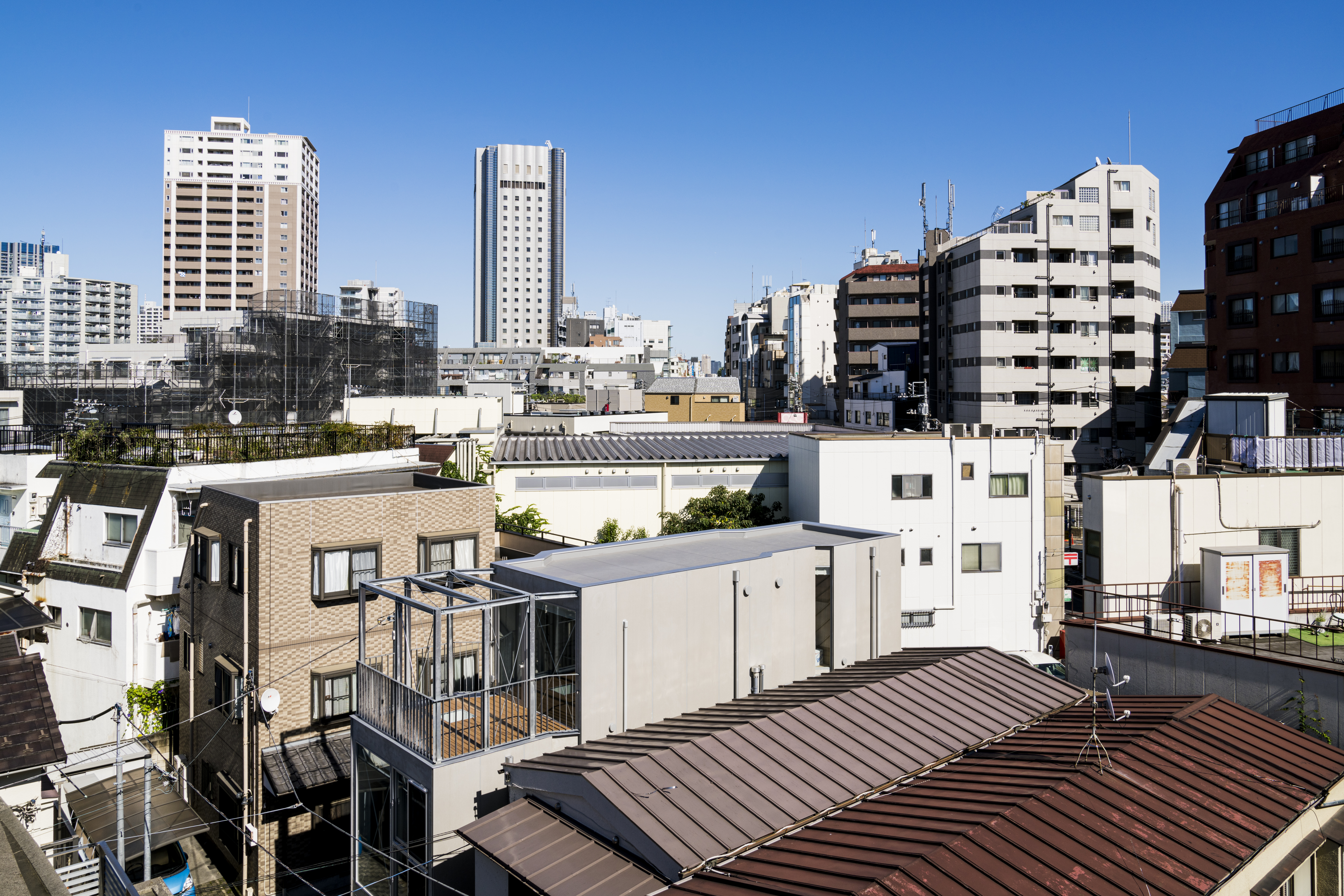 奥行き方向に長い敷地境界の両側から最小限の離隔を取り、さらに外壁を任意に300mmまたは450mmセットバックすることで、内に向かって窪みのある平面とした。外壁のズレで生じる裂け目が窓となり、その開口部を上階に行くに従って少しずつ広げていった。主要構造である柱と梁は全て100x100mmのH鋼で門型に組み、等ピッチで並べ3層に積み上げた。内部を最大化するために顕しとした構造フレームの連続が揺らぎを生み、空に向かって開く窓と相まって、徐々にほどけたトンネル状の空間の積層となった。