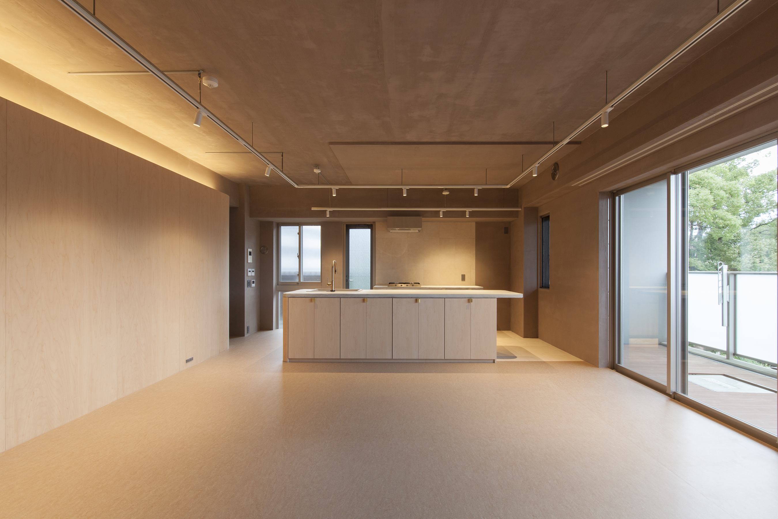 エントランスから中廊下を挟んで左右に個室があり廊下の突き当たりにLDKとなる典型的マンションの間取りをゼロから見直しました。中廊下をなくし浴室・トイレ・収納をまとめたコアを中央に配しました。このひとまとまりのコアの外側は、広めのエントランスが直接リビングにつながり、隣接するダイニングキッチンを経由して窓のある書斎へと続き、再びエントランスに戻る回遊動線となります。コアは角を丸めて全面木で仕上げることで、巨木の幹のような存在感を持ちました。この大きさゆえ、空間はひと続きに連続しながら完全には見通せず、音や光は程よく回り込み、様々な質の空間が数珠つなぎとなりました。床にはリノリウム、壁は土壁とし、コアと家具は木で仕上げました。室内全体をアースカラーの有機素材で統一することで、テラスから見晴らせる豊かな自然に呼応する環境を生み出しました。