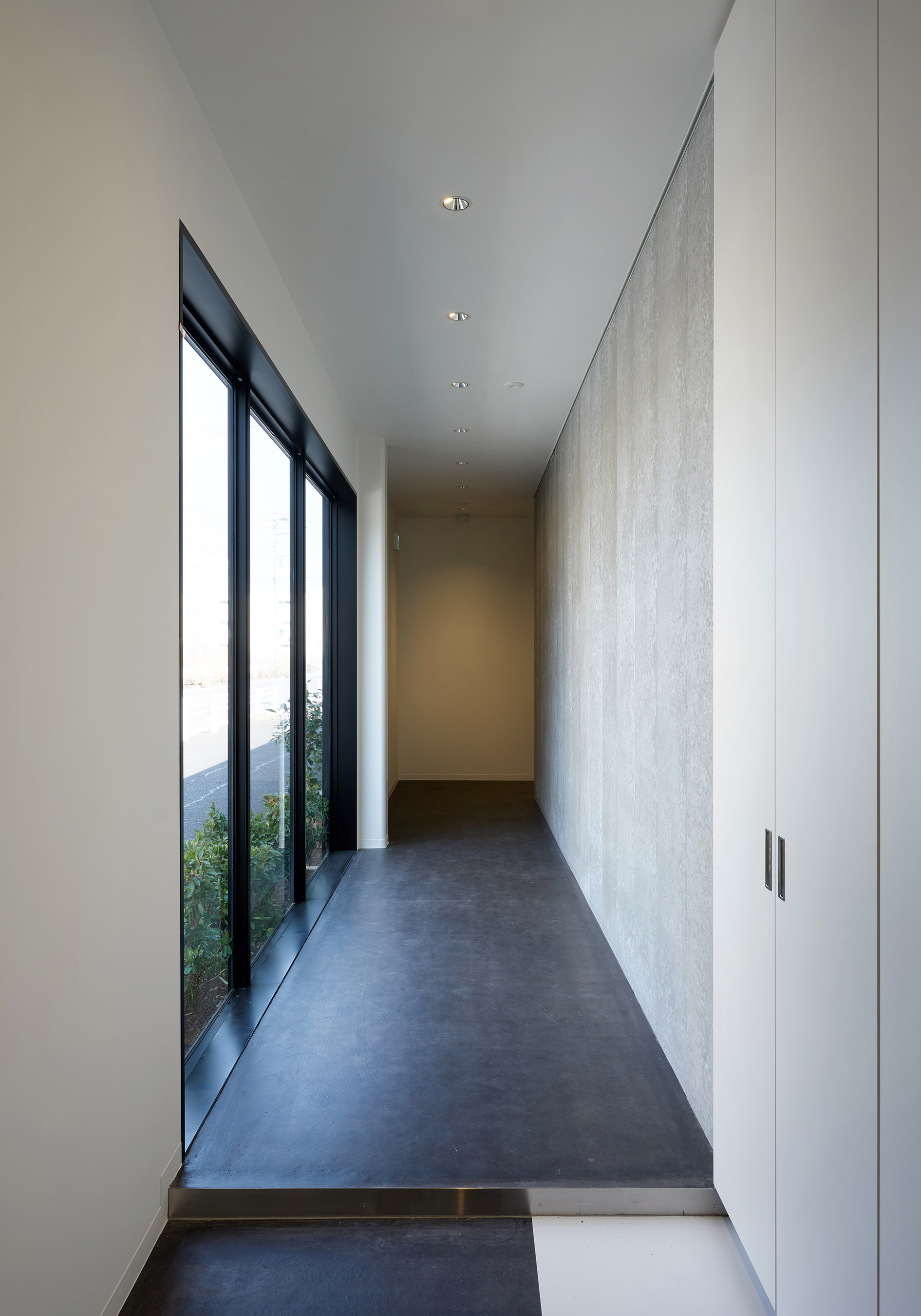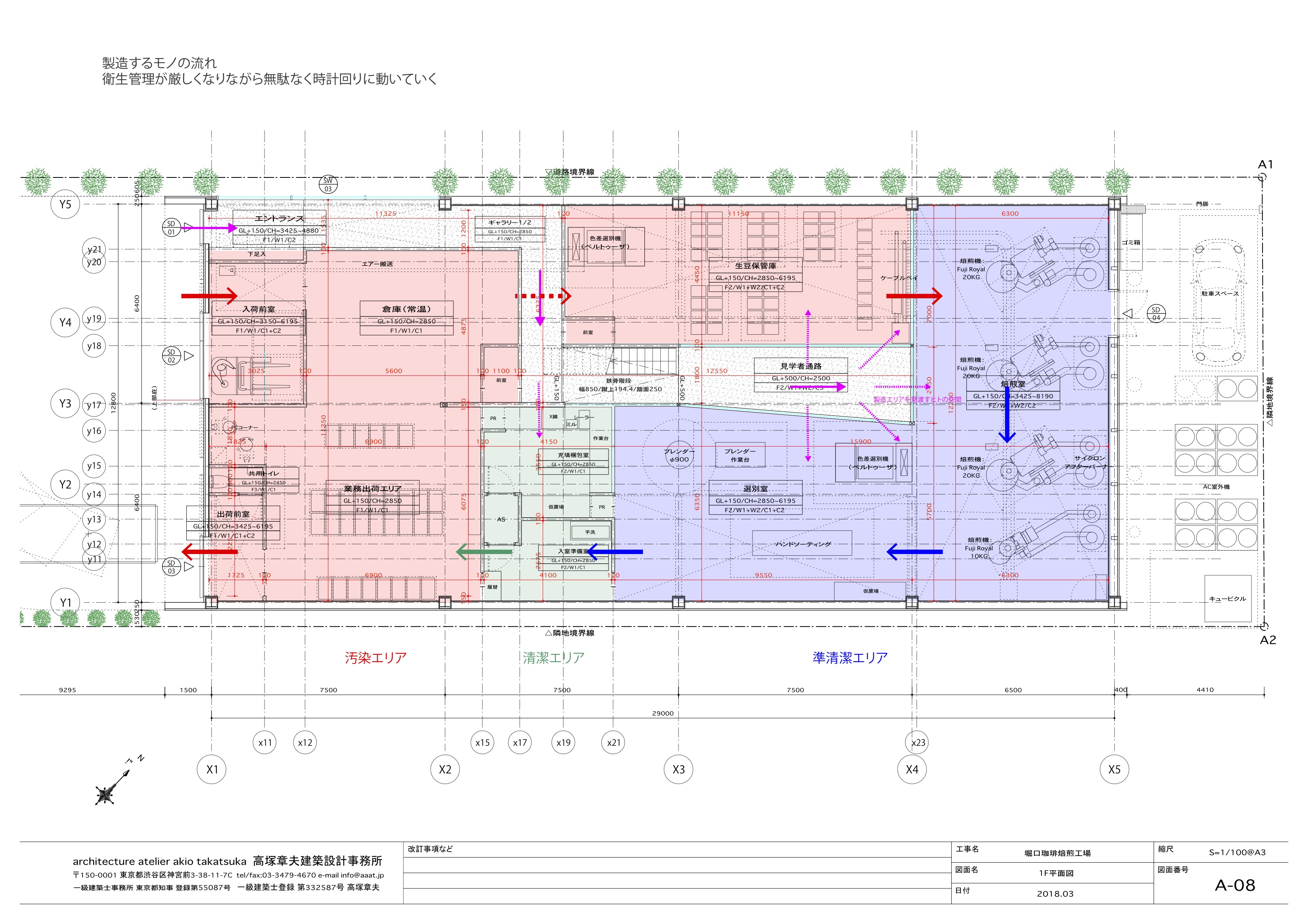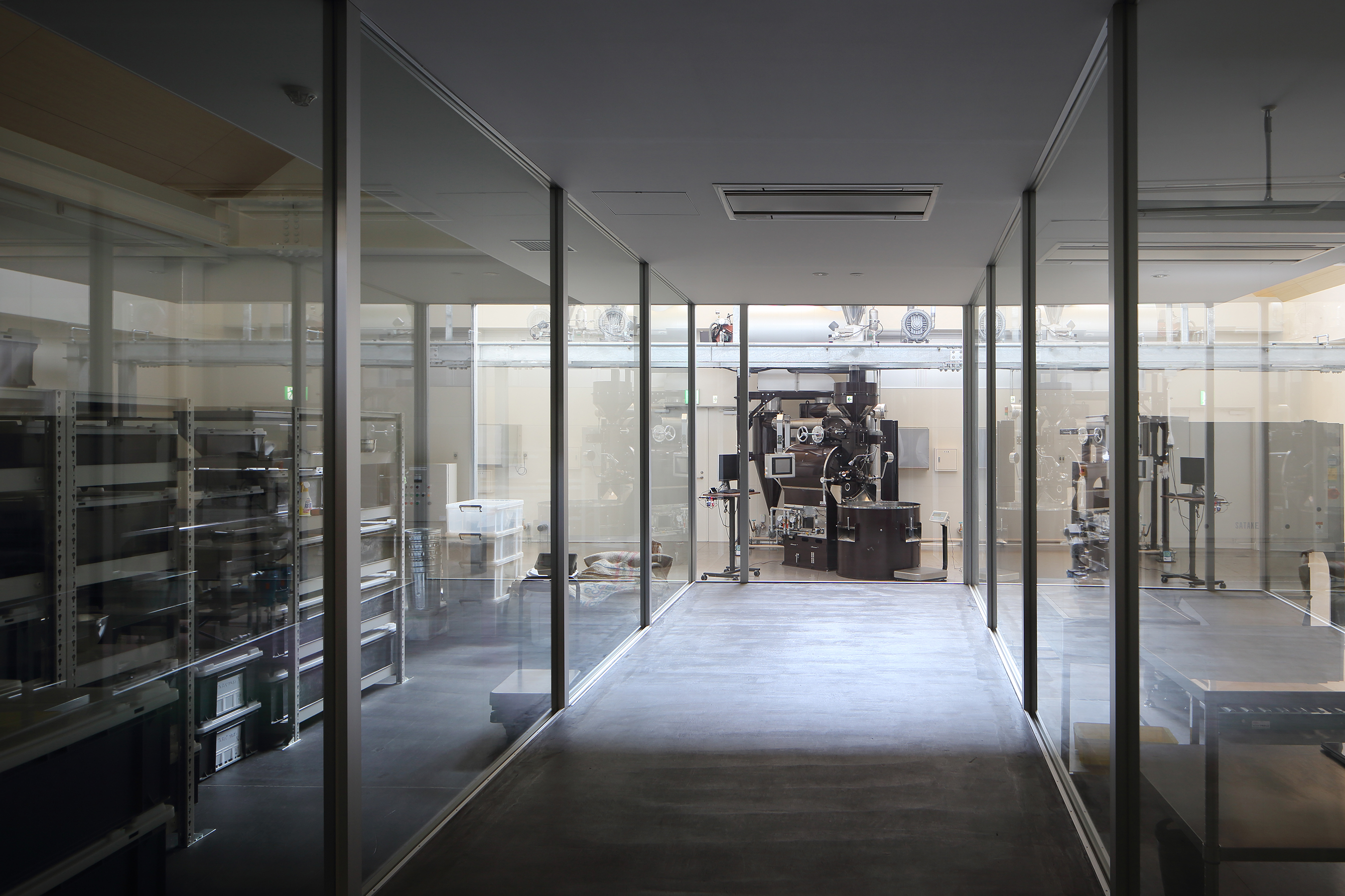 効率化されたモノの動線、明確な衛生区画を踏襲しながら、中央に見学通路を設けました。この通路は焙煎機が立ち並ぶ奥まで続き、各ゾーンを完全に区画する厚い間仕切りにもなります。