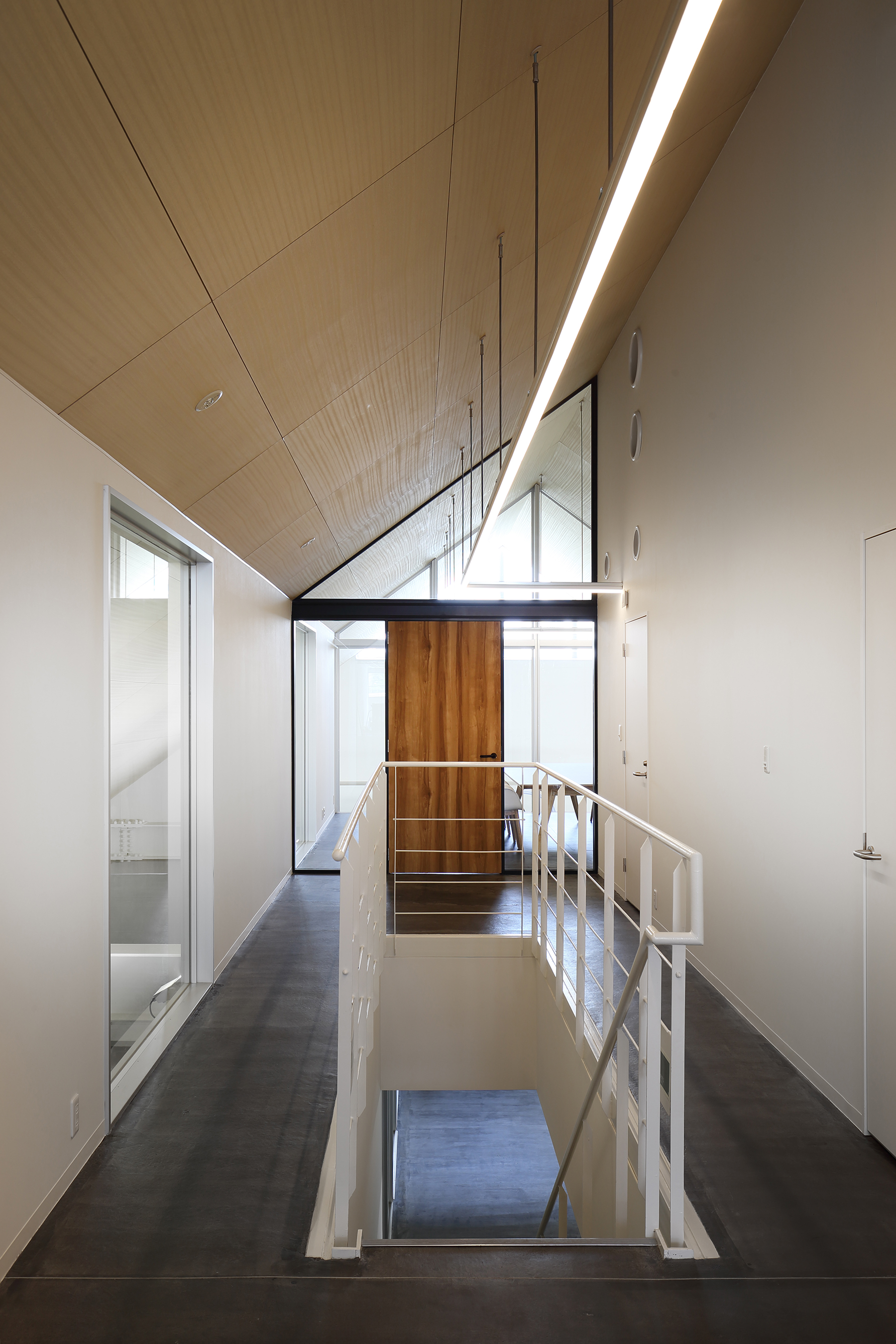 見学者通路から2階に上がり、建物の中央部分をスタッフや来客のための様々な居住スペースとしました。建物中央部は屋根が高く、左右に階下を見下ろす形で製造過程が一望でき、空間を無駄なく活用しています。